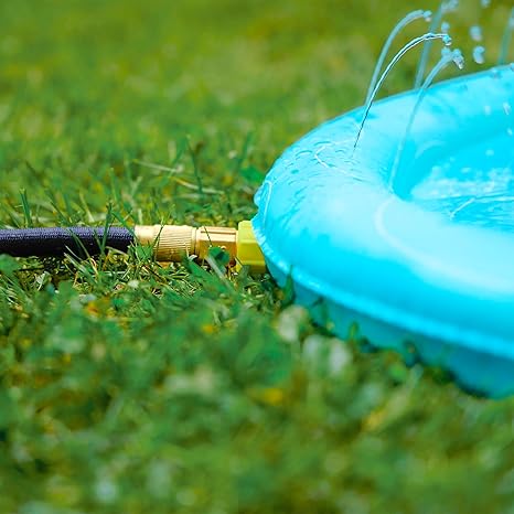 La almohadilla para salpicaduras incluye un aspersor de agua para que los niños jueguen al aire libre mientras se mantienen frescos. Incluye un adaptador de manguera de 3/8 pulgadas y tiene un diámetro grande para mayor espacio de juego. ¡Apto para niños mayores de 1 año!